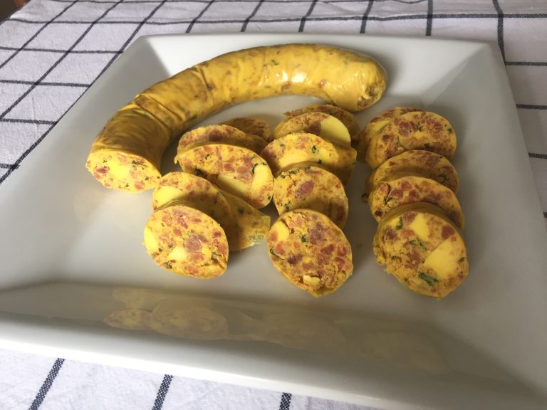 Ingredientes: 1 Kg. de jamón,1 docena de huevos cocidos, 7 huevos crudos, unas ramas de perejil, azafrán, pizca sal y tripas.